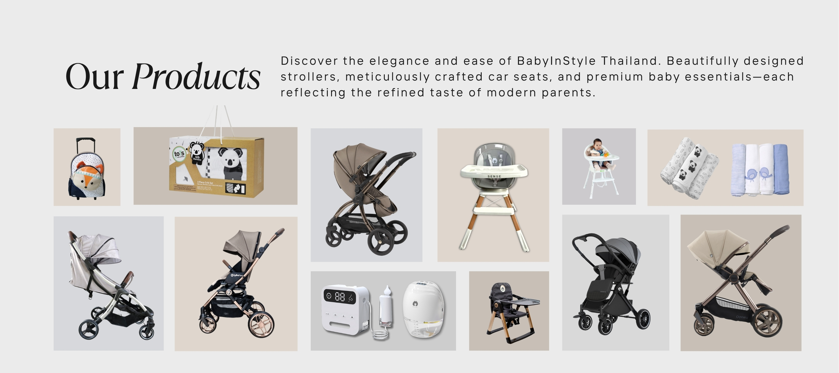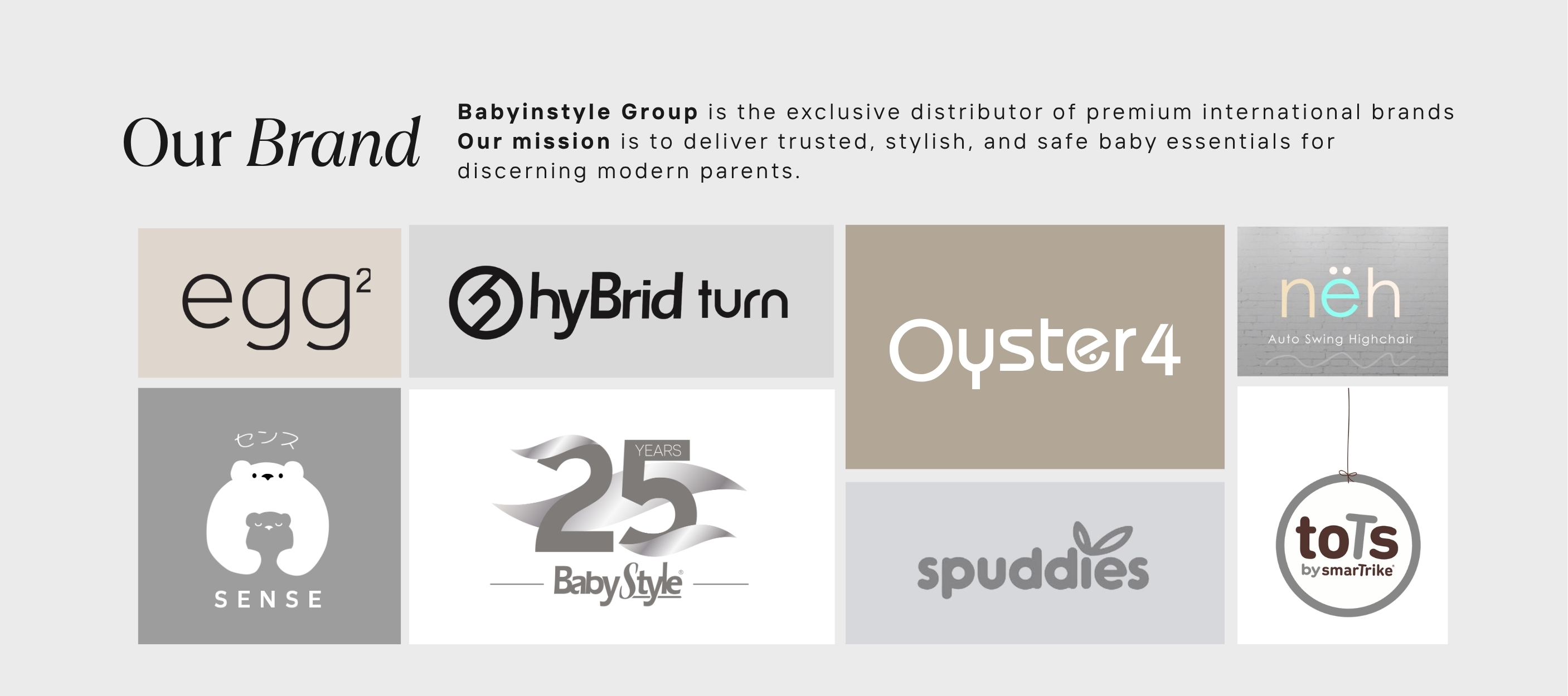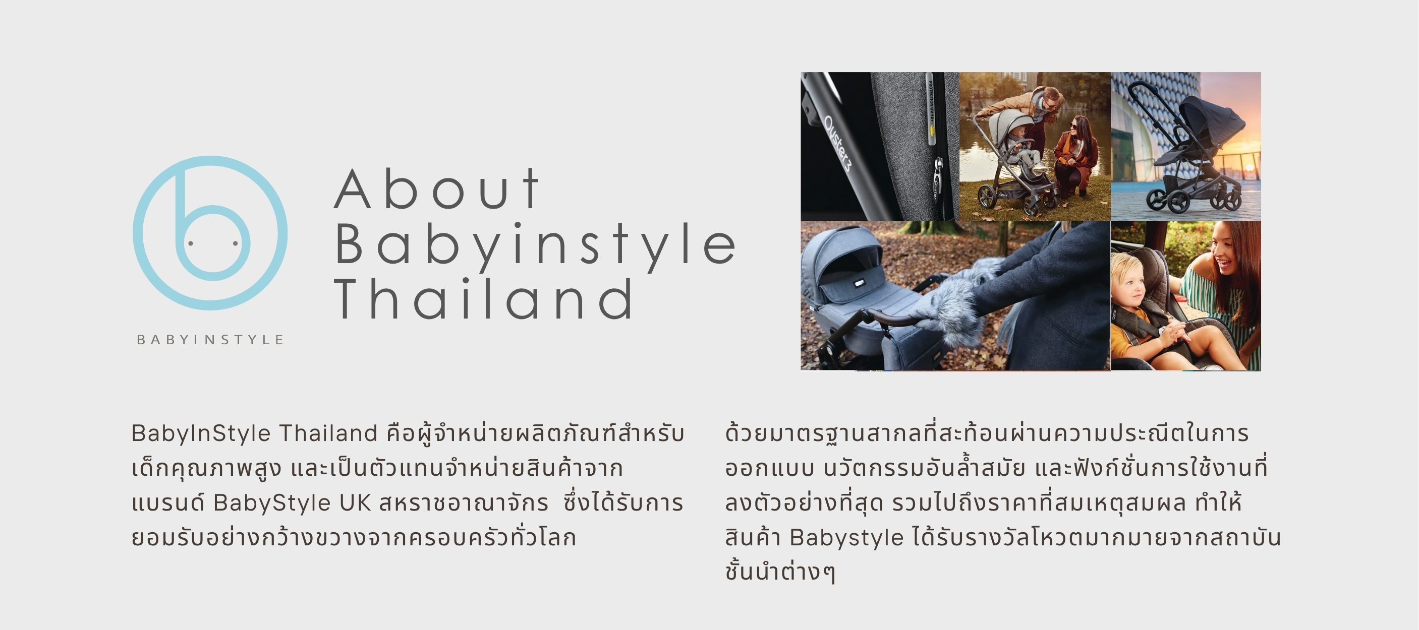 BabyInStyle Thailand คือตัวแทนจำหน่ายผลิตภัณฑ์สำหรับเด็กคุณภาพพรีเมี่ยมทั้ง Local Brand และ International Brand ซึ่ง Signature Brand ของเบบี้อินสไตล์คือ แบรนด์รถเข็นเด็ก Oyster, Hybrid และ Egg ภายใน BabyStyle UK แห่งสหราชอาณาจักร ซึ่งได้รับการยอมรับอย่างกว้างขวางจากครอบครัวทั่วโลก ด้วยมาตรฐานสากลที่สะท้อนผ่านความประณีตในการออกแบบ นวัตกรรมอันล้ำสมัย และฟังก์ชั่นการใช้งานที่ลงตัว